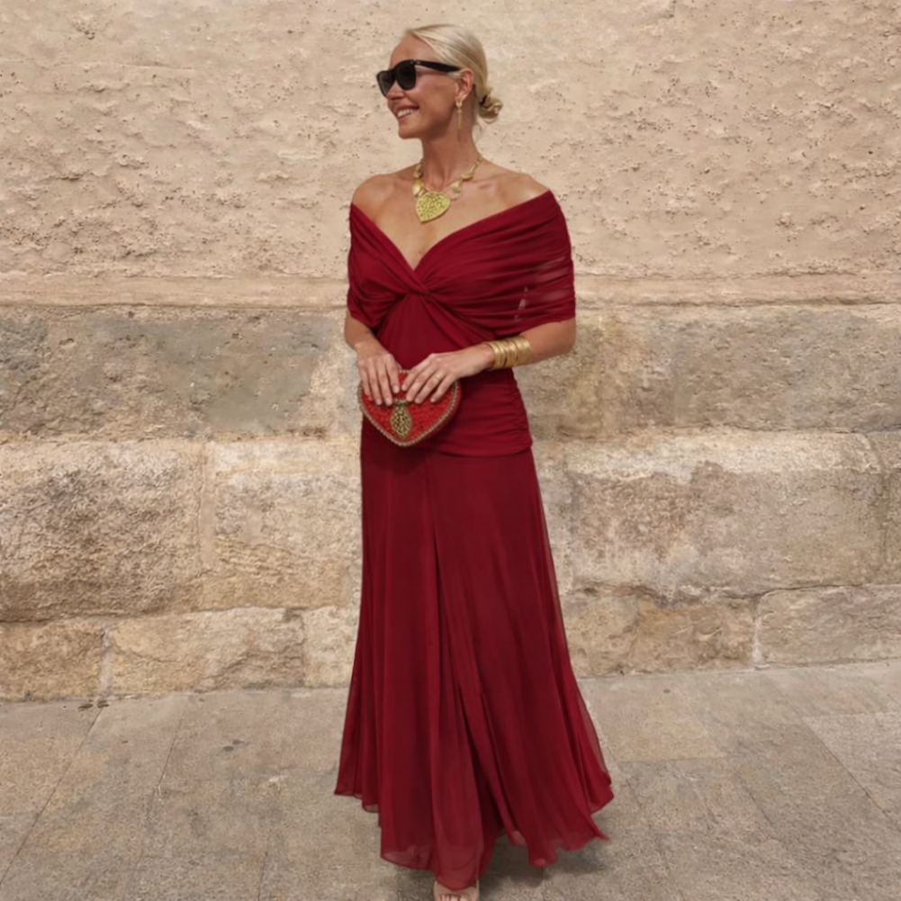 This long dress naturally enhances the silhouette and affirms your presence. Its elegant V-neckline and delicately pleated waist create structure without ever feeling restrictive.